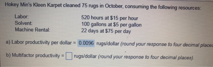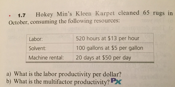 Kleen karpet cleans 65 rugs this takes 520 hours at 13 hour labor productivity 65 520x13 0096 rugs per labor or 104 rug productivity units produced inputs use.